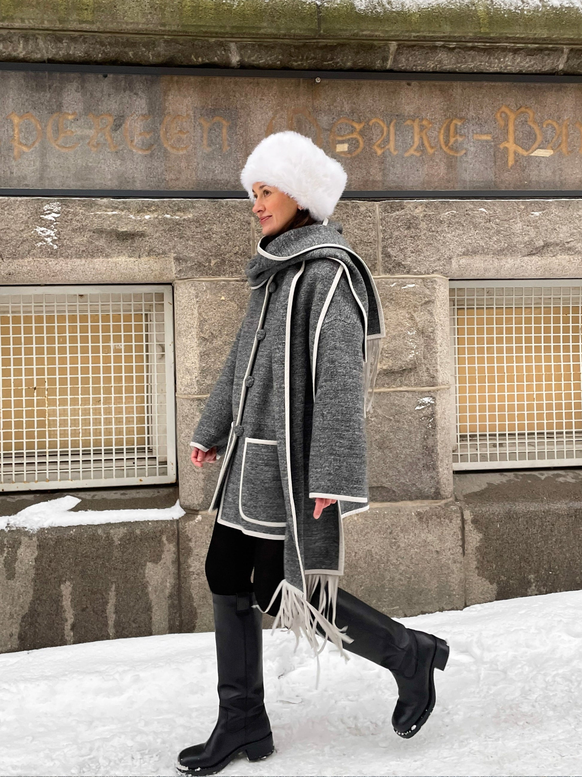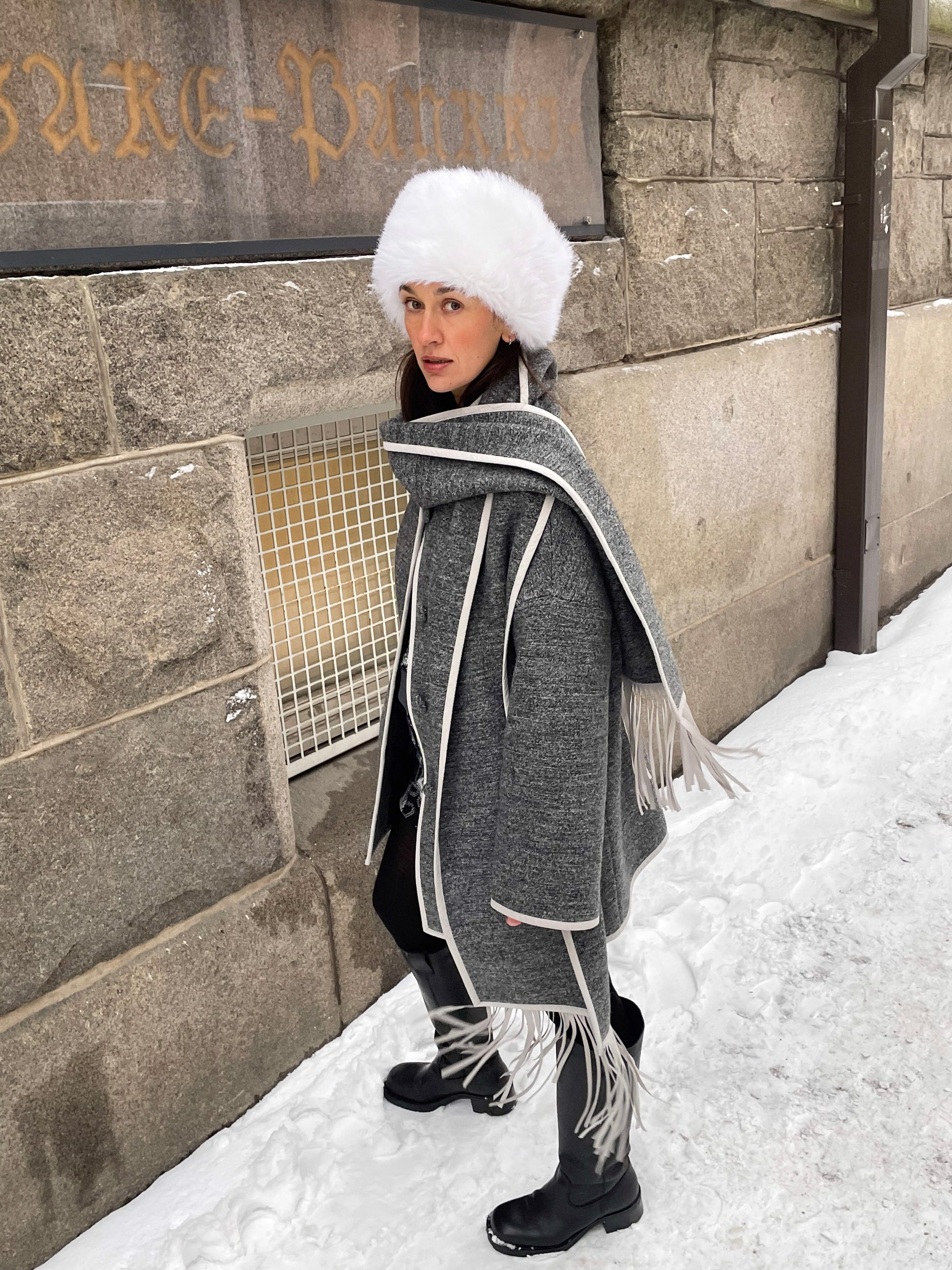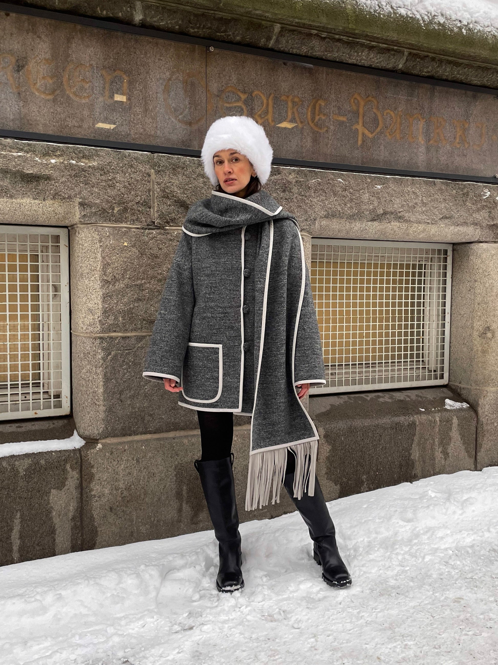 Tähän rentoon ja lämpimään keittovillatakkiin kuuluu elegantti irrotettava huivi, jota voidaan käyttää myös hupun tavoin. Huivissa on hapsut, jotka tuovat takkiin viehättävän yksityiskohdan. Takki on viimeistelty Alcantara-kanttauksilla, mikä korostaa minimalistista siluettia. Takki on vuorattu tikkivuorella. Se on käytännöllinen mutta samalla hienostunut – täydellinen kylmiin päiviin ja talven arkeen.